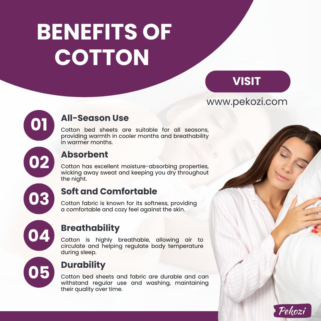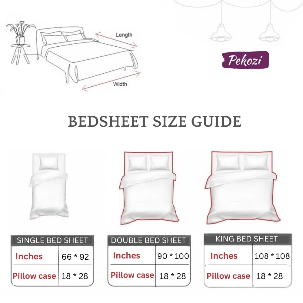 Transform your bedroom with our luxurious cotton bedsheet queen size collection. Crafted from high-quality queen bedsheet are soft, breathable and perfect for all seasons. The rich, vibrant green bedsheets for double bed bring a fresh, natural vibe to your space. Designed cotton queen size bedsheet ensures a snug and perfect fit. These bedsheet for queen size bed not only provide comfort but also durable. The bedsheet and pillow cover set includes 2 pillow covers, For those seeking softness and durability, Pure cotton bedsheet double bed are made from the finest 100% cotton, ensuring a smooth and cozy sleep experience. The breathable fabric of Pekozi bed sheet queen size cotton keeps you cool during warm nights, Our collection includes Bedsheets for queen size bed cotton that offer the finest in both style and comfort. Whether you’re looking for a blue bedsheet or purple bedsheet, we offer a wide variety of color options. The cotton double bedsheets with 2 pillow covers combo ideal for quick, hassle-free switch of bed covers. The bedspread for double bed is designed to drape perfectly over your bed, while the double cot bed sheet ensures ample coverage for larger beds. These Queen bedsheet cotton provide a complete bedding solution. Our Bed sheet queen size cotton are perfect for adding a touch of elegance to your bedroom. For extra coverage jumbo size bedsheet designed to provide a luxurious drape over the sides of bed. We also offer linen bedsheets for more premium feel, combining the softness of cotton. Whether you’re looking for soft bedsheets for double bed for daily or Bed sheets For Queen size bed for special occasions, our collection has something for everyone. These pure cotton bedsheets for double bed are ideal. Choose from carefully curated selection of bedsheets for double bed cotton & create a cozy, stylish bedroom. Each queen size bed sheet designed to bring comfort and luxury to your everyday life, ensuring a restful and relaxing night’s sleep.
